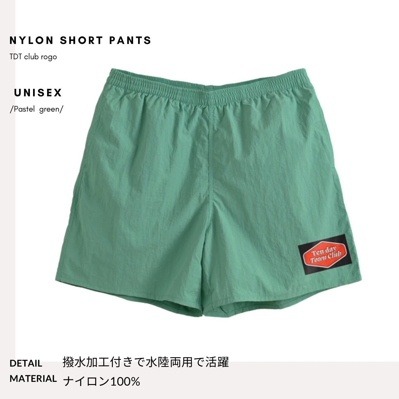 TDT【clubロゴ刺繍】ナイロンショートパンツ パステルグリーン