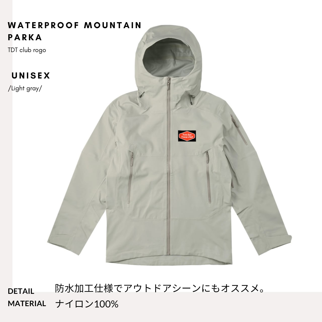 TDT【clubロゴプリント】防水マウンテンパーカー ライトグレー
