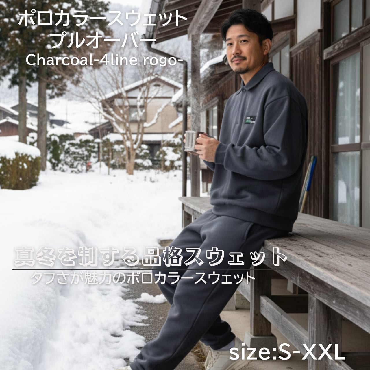 TDT【4lineロゴプリント】ポロカラースウェットプルオーバー チャコール
